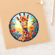 Colourful round laptop decal features a round AI-generated giraffe and floral portrait in stained glass. Great for cars, skateboards, lockers and more!