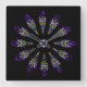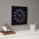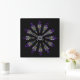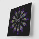 A lovely stained glass pattern adorns this wall clock in dominant colours of purple, blue, yellow and black. Twelve abstract feathers circle a central mask to form a spiritual mandala design with a Native American sensibility.