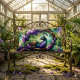 An enchanting peacock rests within a circular wreath of blooming florals and woven branches, rendered in a luminous stained glass style. Jewel-toned blues, greens, violets, and soft golds flow through layered feathers, creating a sense of graceful movement and quiet wonder. The mosaic-inspired background adds depth and softness, blending organic shapes and gentle color transitions that feel both folk-inspired and whimsical. Delicate blossoms frame the composition, lending a romantic cottagecore mood with subtle boho charm. The overall aesthetic is serene yet vibrant, balancing intricate detail with a soothing, storybook atmosphere that celebrates nature, beauty, and quiet elegance. AI generated artwork.