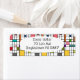 These return address labels have a mid-century modern design of a grid of black lines with squares and rectangles in retro colours on a field of white.