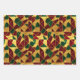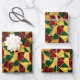 A red, green, and gold abstract geometric pattern in stained glass style decorates this gift wrap. Gold is not glitter or foil. AI-generated by IveyCottage.