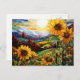 Postcard with the stained-glass painting of sunflowers overlooking the mountainous valley with the sun setting in the distance.