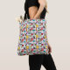 This tote bag has a mid-century modern design of a grid of black lines with squares and rectangles in retro colours on a field of white.