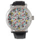 This men's watch has a mid-century modern design of a grid of black lines with squares and rectangles in retro colours on a field of white.