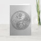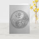 This beautiful yin yang design features two stylised tribal roses and has the appearance of being engraved into stainless steel. Intricate swirls decorate both sides of this traditional symbol creating a delicate pattern. The two flowers flow from the bottom of the teardrop on either side with leaves growing from the stems. Metallic textures and the silver colour give the design a strong steel look. This unique yin yang makes a stunning and stylish card design.