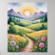 A vibrant and uplifting watercolor painting featuring a winding dirt path through a lush meadow bursting with colorful wildflowers in pink, purple, and yellow. Rolling green hills lead to layered mountains under a dramatic golden sunrise with radiant concentric rays. Dark pine forests frame the scene, creating a sense of peace, hope, and natural beauty—perfect for posters, canvas prints, and inspirational home decor.