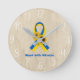 Show your support with this special wall clock featuring ribbon in the blue and yellow colors of Ukraine's flag with sunflowers, the national flower of Ukraine on wood texture background
