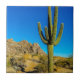 The photograph features a large multi-armed saguaro cactus by a hiking trail which leads towards a boulder strewn mountain in the Sonoran desert.