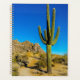 The photograph features a large multi-armed saguaro cactus by a hiking trail which leads towards a boulder strewn mountain in the Sonoran desert.