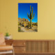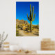 The photograph features a large multi-armed saguaro cactus by a hiking trail which leads towards a boulder strewn mountain in the Sonoran desert.