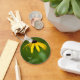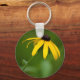 A photograph of a Black-eyed Susan in a garden, surrounded by green plant leaves of the summer.