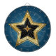 A digital illustration features a five-pointed star with a multi-layered design, set against a gradient blue background. The outermost layer of the star is a gold colour, outlined with a series of small, white, circular lights that appear to be illuminated, creating a sense of depth and sparkle. Inside the gold layer is a black star shape, which provides a stark contrast to the bright gold. At the centre of the black star is a smaller, gold star, adding another layer of dimension to the design. The gradient blue background transitions from a lighter shade at the top to a darker shade at the bottom, which helps to highlight the star in the foreground. The overall style is clean and graphic, with a focus on simple shapes and contrasting colours.
