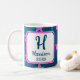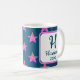 This monogram mug is a great way to start your morning. A bright pink star pattern appears against a bright blue background on both sides of this mug. Your monogram is featured in a square along with the family name and year. The letter, name, and year can quickly and easily be personalised.