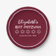 Star of David Pattern Bat Mitzvah paper plate features five star patterns aligned horizontally on a striped background, all within a white circular border. The title 'Bat Mitzvah' and the specific date are in pink. Available for bar mitzvahs as well. © Morning 6