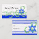 COLOR PALETTE: Royal, cobalt, sapphire Blue, green and white DESIGN COLLECTION: Matching reception table escort seating assignment cards. This design was hand painted in watercolor by Audrey Jeanne Roberts. The Star of David is interwoven with swirling leaves and dots in modern design motif. It's overlaid on a border of the matching leaf flourish and circle pattern. In the background is a pair of dots borders in the background colour. The effect is a whimsical and cute design for your daughter's special day being called to the Torah as a Bat Mitzvah. There is a complete set of products to match and a wide variety of colours to choose from. On the reverse side is a large version of the Star of David with your daughter's name and Celebration date. All information is easily customised with your personalised information via the template fields.