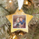 Star shaped photo Christmas ornament for boys or girls. Gold graphic background on both sides. Upload a photo to the front and add the year date. More text can be added to the back to list a name and age or other text. Keep all wording away from edges!