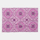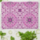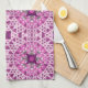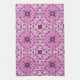 This towel's design reminds me of the 70's. It is a geometric pattern consisting of diamonds, circles, and squares in shades of purple. There are stars interspersed throughout the design.