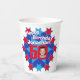Personalise these bright 50th birthday party paper cups with your own birthday name and photograph in the 0 of 50 on both sides one for your photo now and one from your past. Fun star pattern and text and personalised photo design in bright red, cyan and royal blue. Ideal for using at a fiftieth birthday party. Other matching items and colour options are available. © Original graphic art and design by Sarah Trett for www.mylittleeden.com