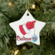 This star shaped whimsical design has a Santa hand with a blue ornament dangling from the end of a string. There is customisable text on the blue ornament for you to add the year. Additional colourful text reads: "Believe". This design makes a great gift for "believers" of any age!