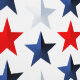 Red, silver and blue big 2 D stars against white wallpaper.
