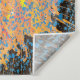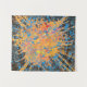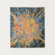 The painting features a predominantly black background that creates a stark contrast with the vibrant colors in the foreground. The central area of the painting showcases a large burst of orange paint, radiating outward in all directions, creating a sense of movement and energy. The orange burst is overlaid with numerous blue splatters of varying sizes, adding to the dynamic and energetic feel. There are also hints of other colors such as red, yellow, and pink interspersed within the orange burst, adding depth and complexity to the composition. The painting's chaotic yet harmonious arrangement of colors and splatters makes it visually striking and engaging. The combination of different colors and splatters creates a textured effect, adding to the overall visual interest. This piece is a captivating example of abstract art, using bold colors and dynamic patterns to create a sense of movement and energy. It draws the viewer's attention with its vibrant and energetic esthetic, inviting them to explore its intricate details.