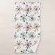 This towel set has a light blue washcloth, a pea green hand towel, and a bath towel with a mid-century modern design of starbursts scattered all over with circles on the end.