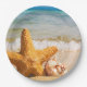 Paper plates with a cute photograph of a starfish positioned upright in the sand. Underneath it's arm is a little seashell resting comfortably. Set on a beach with waves crashing in the background.