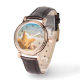 A watch with a cute photograph of a starfish positioned upright in the sand. Underneath it's arms are 2 little seashells resting comfortably. Set on a beach with waves crashing in the background.