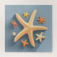 An illustration of a big yellow starfish with some other smaller starfish. Gray background.