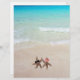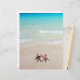Printable starfish bride and groom blank paper to print your own invitations or notes. A beach scene of blue ocean water and sand covers the background with two starfish holding hands at the bottom.