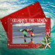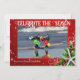 Red Christmas photo greeting card with starfish and holly design. Modern, swirling font at the top reads, “Celebrate the Season” and is easy to change to a greeting of your choice. Include a signature at the bottom using one or two lines of text. Colours are red and white with some green holly, and twinkling stars background. A similar design on the reverse is also red with sea stars. Buy as printed cards with envelopes, or choose the download option.