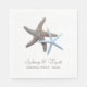 Rehearsal dinner napkins with two starfish and custom lines of text. A big brown and light blue starfish couple in the centre of white, or ecru, paper napkins with two lines of template text beneath. Include names of the bride and groom, with occasion (rehearsal dinner) and date. Use for showers and reception as well.