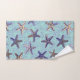 Starfish in the Sand with Coralize Bath Towel Set. Colourful starfish in purple, pink, grey, and brown on a teal blue and purple textured background. Accenting the set is Coralize, coral in shades of purple. Ocean, seashore, nautical beach house inspired bathroom decor.