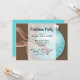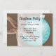 Holiday party invitation with a tropical theme. Horizontal design with a big starfish / sea star and blue ball ornament as the backdrop for custom wording. The background is dark brown. Wording is printed on a transparent panel, which gives the invite a dimensional appearance. Changing the size may alter the design and / or wording to not fit correctly. No text should be close to the edge of the paper. Reverse is solid turquoise blue.