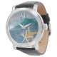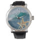 Starfish wristwatch with crashing ocean wave and single monogram initial template. Choose any band style for men or women who love the sea.