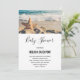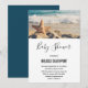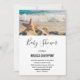 Baby Shower invitation with a scenic photo. A big starfish set upright on a sandy beach. A beautiful blue sea with waves of white surf in the background.