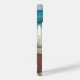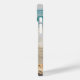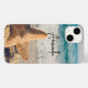A phone case with a scenic photo. A big starfish set upright on a sandy beach. A beautiful blue sea with waves of white surf in the background.