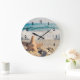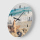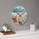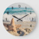 A clock with a scenic photo. A big starfish set upright on a sandy beach. A beautiful blue sea with waves of white surf in the background.