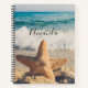 A personalised spiral notebook with a scenic photo. A big starfish set upright on a sandy beach. A beautiful blue sea with waves of white surf in the background.