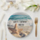 Paper plates with a scenic photo. A big starfish set upright on a sandy beach. A beautiful blue sea with waves of white surf in the background.