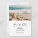 Save the date card with a scenic photo. A big starfish set upright on a sandy beach. A beautiful blue sea with waves of white surf in the background.