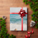 Wrapping paper with a scenic photo. A big starfish set upright on a sandy beach. A beautiful blue sea with waves of white surf in the background.