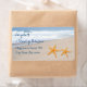 A wedding label design that highlights photo of a starfish pair on the sand of a beach. A modern design for your destination summer beach wedding.