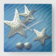 DRAWING OF STARFISH AND SEASHELLS ON THE OCEAN FLOOR, LAYING ON THE SAND. BLUE COLOR