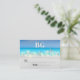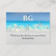 A beautiful photograph of a sandy white beach infused with a starfish and bubble graphic with crystal clear turquoise blue water and a sunny blue sky on which the bridal couples initials; the guest's name, table number and a personalised thank you message from the bridal couple appear.