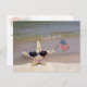 Starfish wearing flag sunglasses and bikini holding an American flag in beach sand.