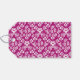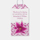 Pretty wedding favour gift tag done in a violet pink on white floral damask pattern. Graphics of a white text area, on the front and a violet pink Stargazer lily decorates the bottom front of the tag. Personalise the violet coloured text, on the front of the gift tag, to read what you want. Matching wedding products are available.