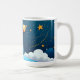 Cute teddy astronaut sitting on soft clouds under a navy night sky with golden stars and dotted star trails—wraparound white ceramic coffee mug.