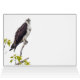 An osprey stands perched on a branch, gazing at the photographer, amidst early spring leaves.