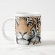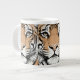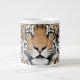 A close-up of a tiger's face with its piercing eyes. The image focuses on the detailed patterns of its fur and expressive gaze.